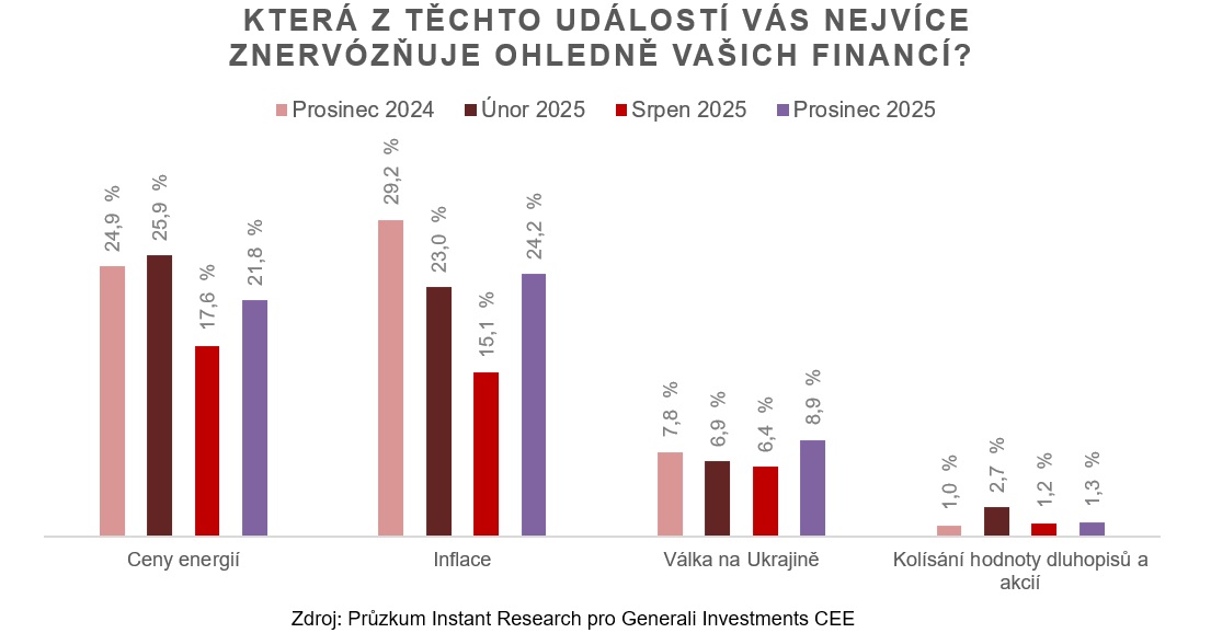 Téměř čtvrtina domácností kvůli svátečním výdajům sahá do úspor či investic a zhruba šest z deseti lidí plánuje šetřit na vánočních dárcích a zimních dovolených. Ačkoli se inflace postupně stabilizuje, její dopady lidé dál citelně vnímají, a zůstává tak hlavním zdrojem finančních obav. Z inflace má aktuálně obavy 24 procent tuzemských domácností.