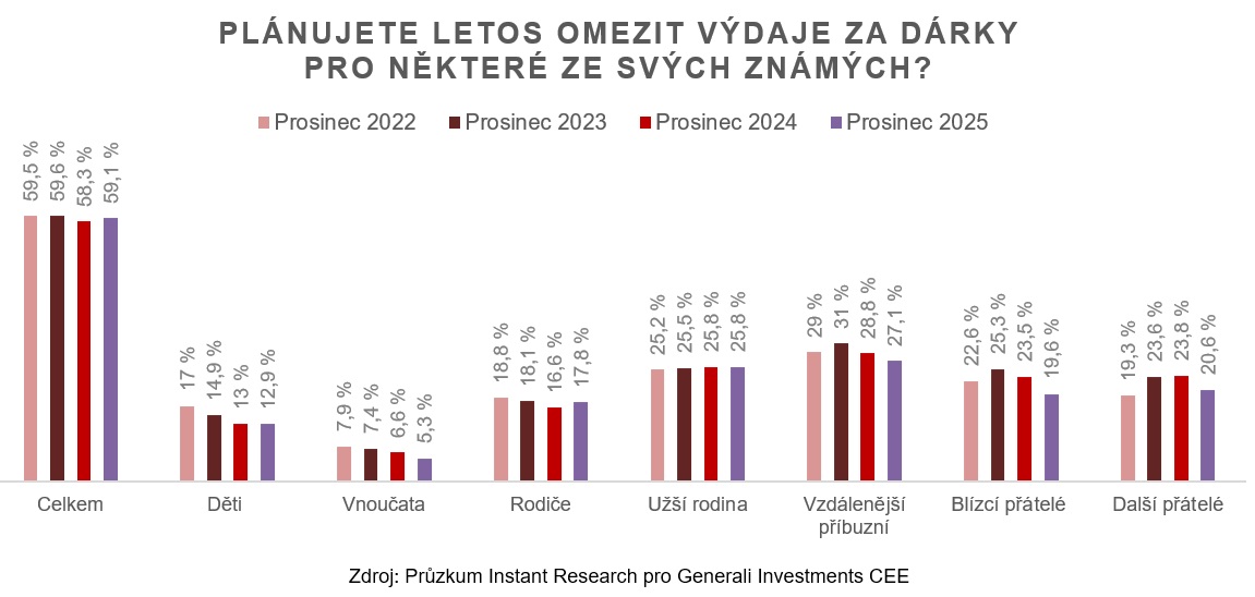„Data ukazují, že se Češi letos během svátečních oslav opět plánují uskromnit. Domácnosti nejčastěji omezují výdaje u vzdálenější rodiny či přátel, zatímco na dětech a vnoučatech šetří jen výjimečně,“ uvedl Marek Beneš, finanční ředitel společnosti Generali Investments CEE.