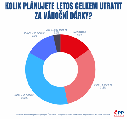 Podle šetření 36 procent Čechů plánuje za dárky utratit mezi 5 001 a 10 000 korunami, dalších 31 procent počítá s částkou mezi 2 001 a 5 000 Kč. Přibližně 15 procent zůstane pod hranicí dvou tisíc korun a 14 procent domácností plánuje výdaje mezi 10 000 a 20 000 korunami. Pouze tři procenta lidí mají rozpočet vyšší než 20 000 korun.