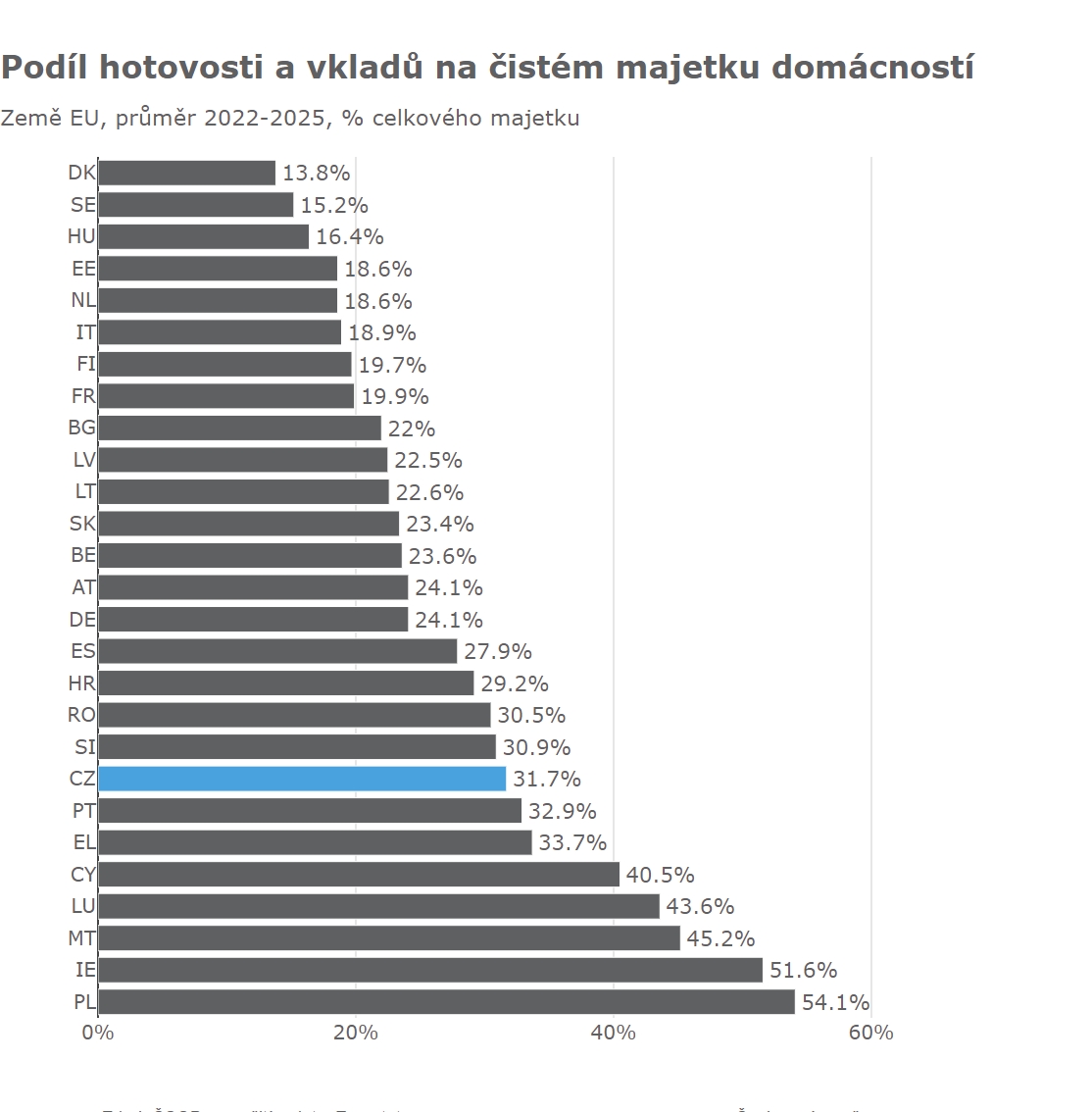 Když pomineme Maďarsko nebo Bulharsko s výrazným podílem investic domácností v nemovitostech, mají nejnižší podíl „neproduktivních“ vkladů na čistém jmění domácnosti v Dánsku a Švédsku, kde domácí kapitálový trh patří k nejrozvinutějším:
