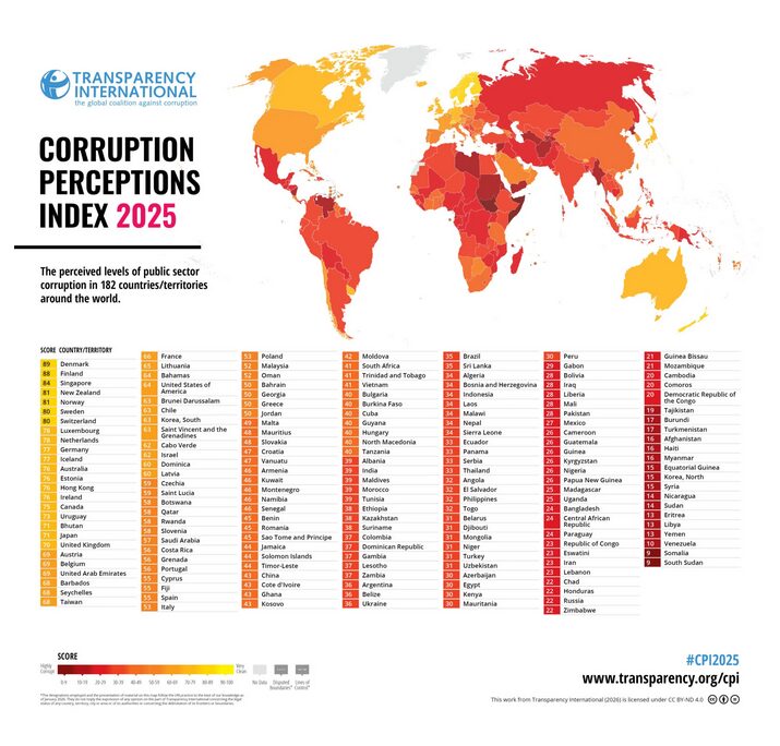 Nejde tedy o názor obyvatel dané země, ale vychází ze zdrojů a indexů mezinárodních institucí. Česká republika dosáhla skóre 59 bodů ze sta možných, tedy více než v roce 2024, a vyrovnala tím svůj nejlepší výsledek z roku 2018.