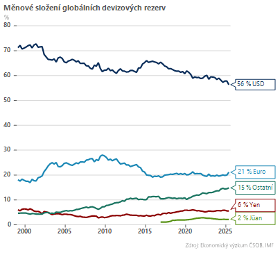 Euro dlouhodobě stagnuje okolo 20% podílu, avšak eurozóna je institucionálně nedovařený projekt – chybí společná fiskální politika i dluh jako alternativa bezrizikového aktiva k americkým vládním dluhopisům. A co Čína? Jüan má podíl pouhá dvě procenta, ale hlavně přísné kapitálové kontroly, což ho automaticky vylučuje z tohoto klání.