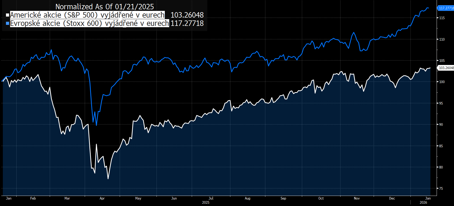 Od 21. ledna loňského roku, což byl první den po Trumpově inauguraci do úřadu prezidenta Spojených států, přidaly do pátku minulého týdne evropské akcie v eurech 17,3 procenta, zatímco ty americké v téže měně jen 3,3 procenta.