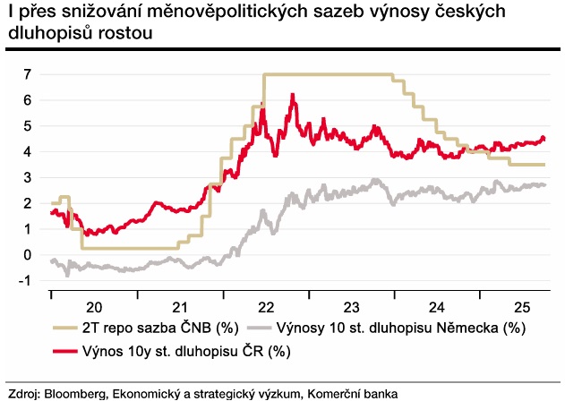Podíváme-li se například na výnos desetiletého státního dluhopisu ČR, ten momentálně dosahuje zhruba 4,5 procenta, poblíž kterých byl i před necelými dvěma lety, kdy bylo zahájeno snižování klíčové sazby České národní banky z tehdejších sedmi procent.