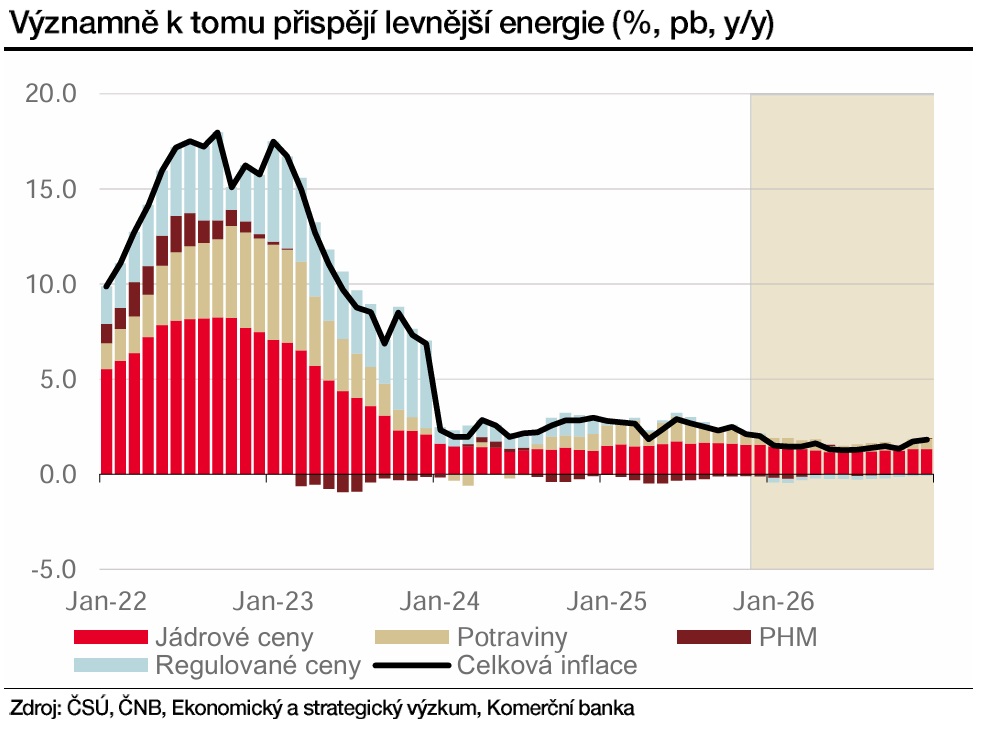 Regulované ceny zůstanou protiinflačním faktorem i v roce 2026. Pro prosinec odhadujeme jejich jen nepatrný meziroční nárůst o 0,3 procenta po listopadových 0,1 procenta. Ceny energií pro domácnosti postupně klesají s tím, jak jednotliví dodavatelé v cenách pro koncové zákazníky zohledňují předchozí pokles cen elektřiny a plynu na velkoobchodních trzích.