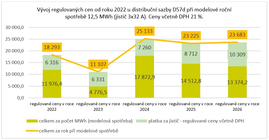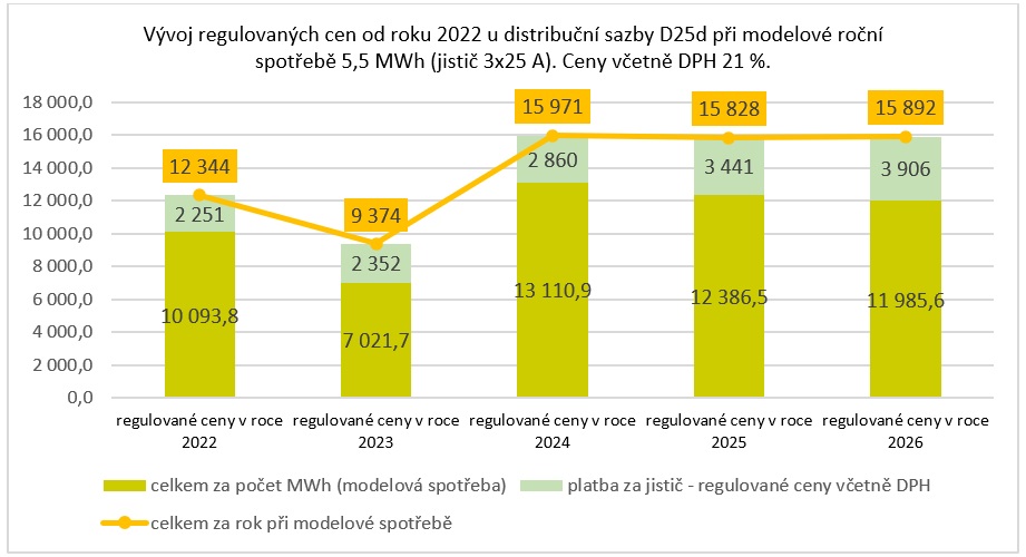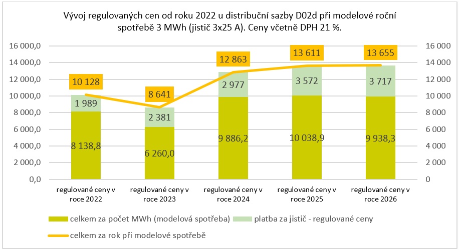 Na distribučním území ČEZ Distribuce u nejběžnější distribuční sazby D02d dojde k mírnému snížení ceny za megawatthodinu (MWh) a zvýšení fixního platu, který známe jako platbu za jistič. Při modelové roční spotřebě 3 MWh vzrostou náklady za celý rok pouze o 44 korun. Cenový růst tak představuje 0,3 procenta.
