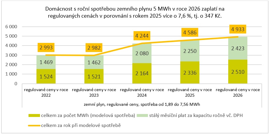Podle návrhu zaplatí v roce 2026 domácnost s roční spotřebou zemního plynu 5 MWh o 347 korun, tedy o 7,6 procenta více než v roce 2025.