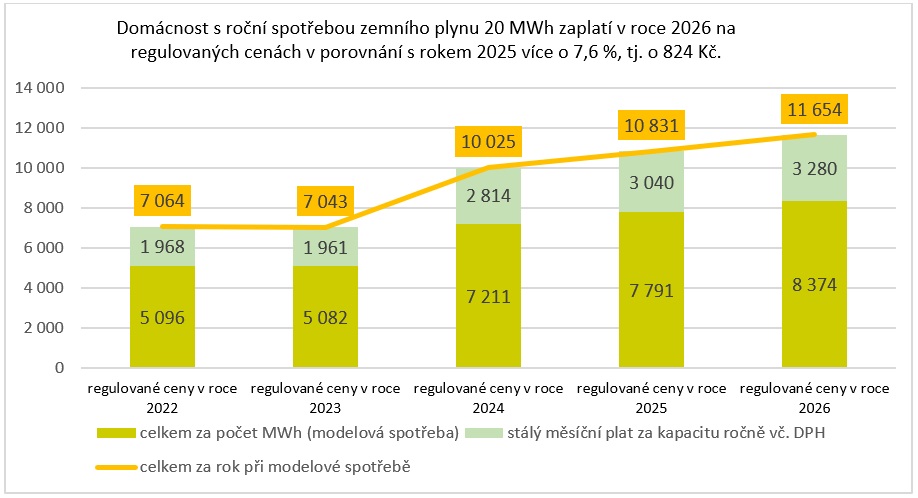 Podle návrhu zaplatí v roce 2026 domácnost s roční spotřebou zemního plynu 20 MWh o 824 korun, tedy o 7,6 procenta více než v roce 2025.