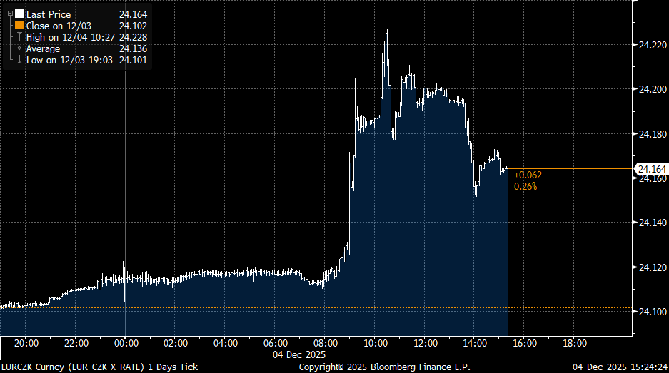 Regionální měny ve čtvrtek oslabovaly, česká koruna vůči euru během dne ztrácela až deset haléřů, když se kurz z ranních 24,12 posunul v průběhu dopoledne až k 24,22 CZK/EUR. V odpoledních hodinách se situace zklidnila a kurz korigoval návratem těsně pod hladinu 24,20 CZK/EUR.
