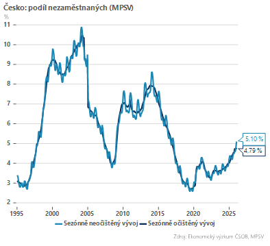 Ke konci ledna 2026 evidoval Úřad práce ČR 378 547 uchazečů o zaměstnání, což je o 58 031 více než před rokem. Počet nově evidovaných nezaměstnaných byl meziměsíčně vyšší o 26 000 a meziročně narostl o 14 486 osob. Lednový růst nezaměstnanosti byl však tentokrát vyšší, než by odpovídalo běžné sezonnosti.