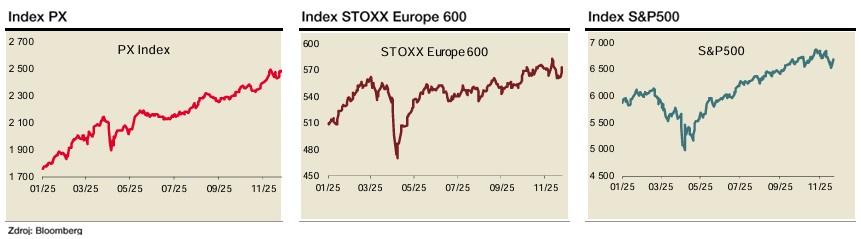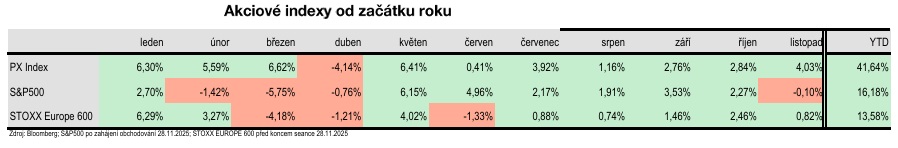 Stále platí, že letošní duben (-4,14 %) byl v tomto roce zatím jediným měsícem, kdy index PX oslabil. Listopad je v tomto roce tedy desátým růstovým měsícem. Za listopad vzrostla jeho hodnota o 4,03 procenta (2 493,07 b.). V listopadu dosáhl index asi bez překvapení nového rekordu, který činí 2 502,88 bodu (12. 11. 2025). Od začátku roku je tak index silnější o 41,64 procenta.