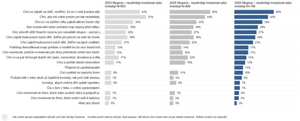 Češi se podle výsledků průzkumu projevují jako velmi uvážliví investoři, v jejichž motivacích převažuje jako důvod investování zlepšení kvality života, nikoliv jenom finanční návratnost. Téměř polovina respondentů průzkumu (47 % dotázaných) tak často uvádí, že nejlepšími investicemi pro ně jsou ty do rodiny a do dětí.
