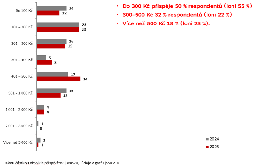 Částku do 300 Kč věnovalo celkem 50 procent respondentů, což je mírný pokles oproti roku 2024. Více než 500 korun přispělo 18 procent dotázaných. Do 200 korun přispívá 48 procent domácností s příjmem do 30 000 Kč, 45 procent obyvatel menších obcí do 1 000 obyvatel a lidí bez maturity a 42 procent obyvatel Moravy a Slezska.