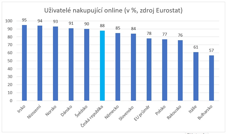 Obyvatelé Česka patří mezi ty, kteří na webu nakupují nejčastěji. V měřené věkové skupině uživatelů internetu ve věku 16–74 let loni alespoň jednou online nakoupilo 88 procent obyvatel ČR. Vůbec nejvíce online v EU nakupují Irové (95 %), víc než 90% podíl nakupujících na internetu mají i Nizozemci a obyvatelé Skandinávie. Naopak v rámci EU jsou při nákupech nejméně aktivní Bulhaři a Rumuni.