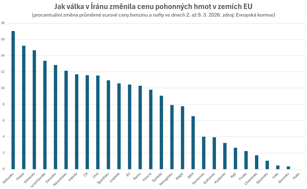 Nejméně pohonné hmoty v reakci na válku v Íránu zdražily v rámci EU na Maltě, kde jsou ovšem fixovány státem, a dále ve Slovinsku, v Irsku a na Slovensku, kde růst cen činil v průměru po řadě 0,4 procenta, 0,5 procenta a konečně 1,1 procenta. Na Slovensku je tak procentuální rozsah zdražení zhruba 11krát nižší než v sousední České republice.