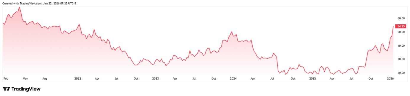 Hodnota akcií společnosti Intel ve středu 21. 1. 2026 vzrostla o 11 procent a uzavřela nad klíčovou technickou hranicí 54 dolarů. Pro investory, kteří mají Intel ve svých portfoliích, jde o mimořádně důležitý moment, protože jde o nejvyšší cenu od ledna 2022.