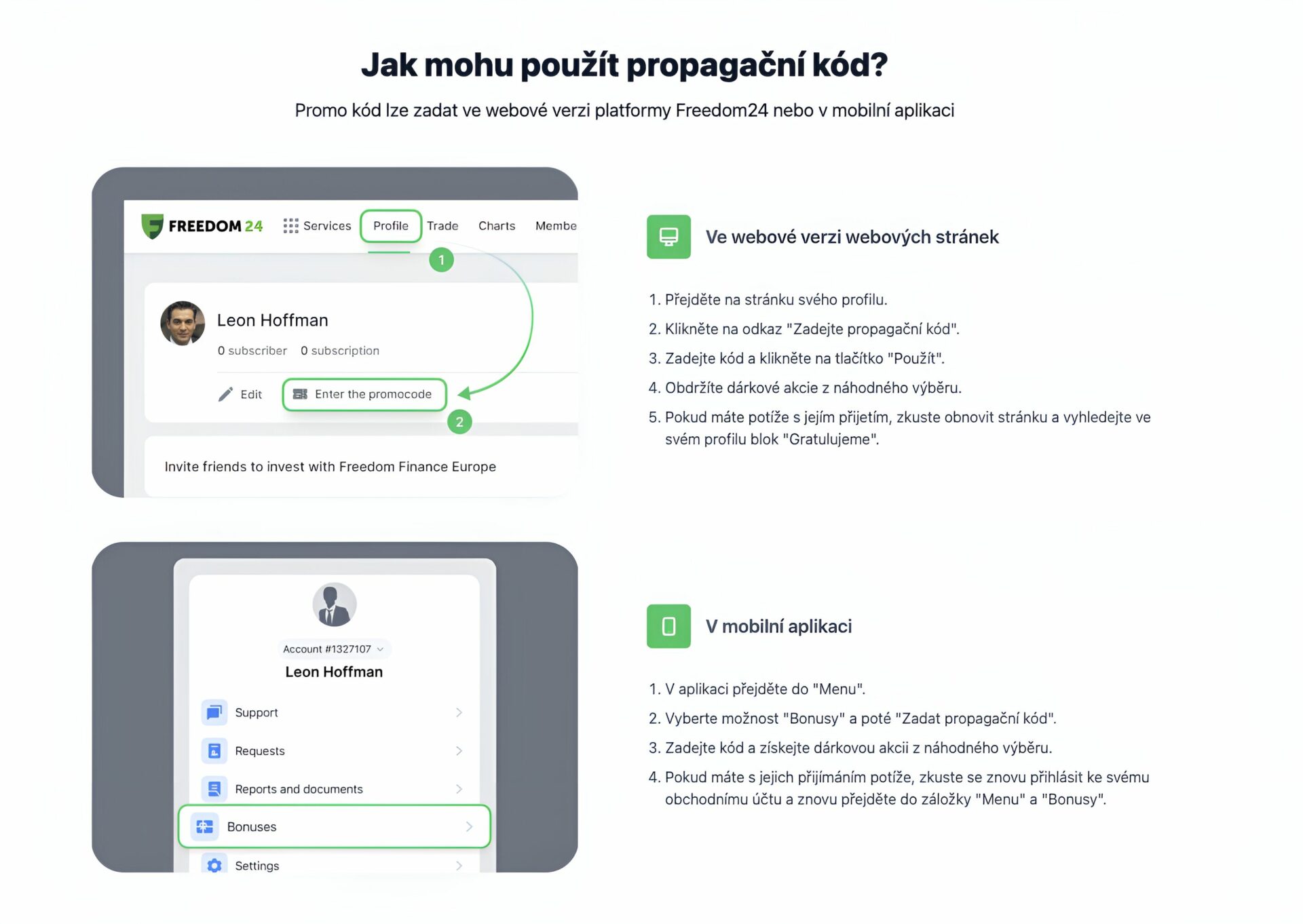Využít můžete také aktuální promo akce. Zaregistrujte se na Freedom24 do 31. srpna 2025, proveďte počáteční investici a získejte až 20 akcií zdarma. Výše odměny závisí na velikosti vaší investice: Při částce od 5 000 EUR získáte 4 akcie, při 20 000 EUR obdržíte 10 akcií a při investici 50 000 EUR nebo více až 20 akcií. Pro aktivaci využijte promo kódy WELCOME5, WELCOME20 a WELCOME50. Od 1. května 2025 bude navíc možné získat 1 akcii zdarma již při vkladu od 1 000 EUR/USD a použití promo kódu WELCOME1. Tato nabídka je určena výhradně novým klientům.
