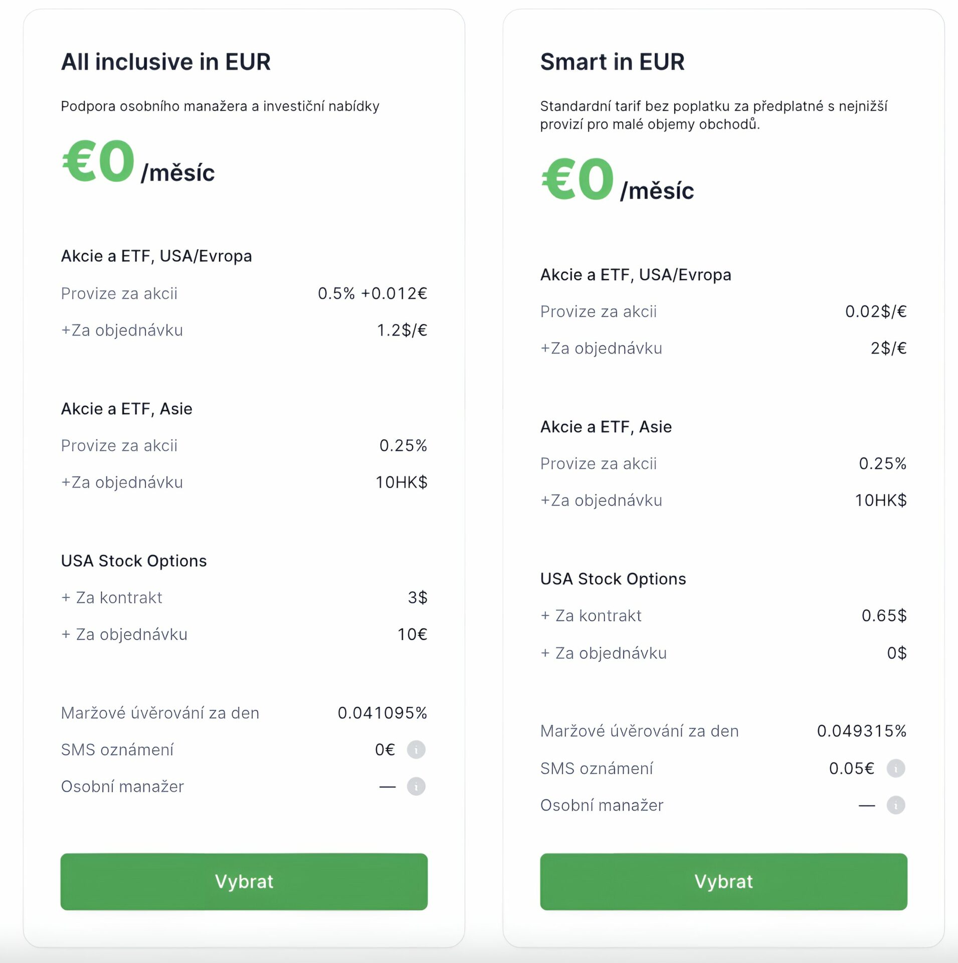 - Smart v eurech či dolarech: Ideální pro transakce v eurech bez měsíčních poplatků. Poplatky za americké a evropské akcie a ETF činí 2 USD/EUR za transakci plus 0,02 USD/EUR za akcii.