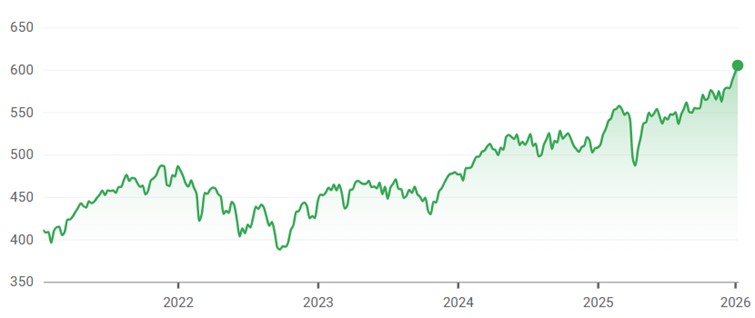 Netrvalo dlouho a další den přinesl nový rekord na více než 605 bodech. Index sice mírně ustoupil z maxim, avšak stále si udržoval pozici a 7. ledna uzavřel na 604,99 bodech. Jde tak o pokračování růstu z roku 2025, kdy vzrostl o více než 17 procent. Loni index zaznamenal výraznější korekci pouze v dubnu. Za posledních pět let šlo o nárůst hodnoty o 47 procent.