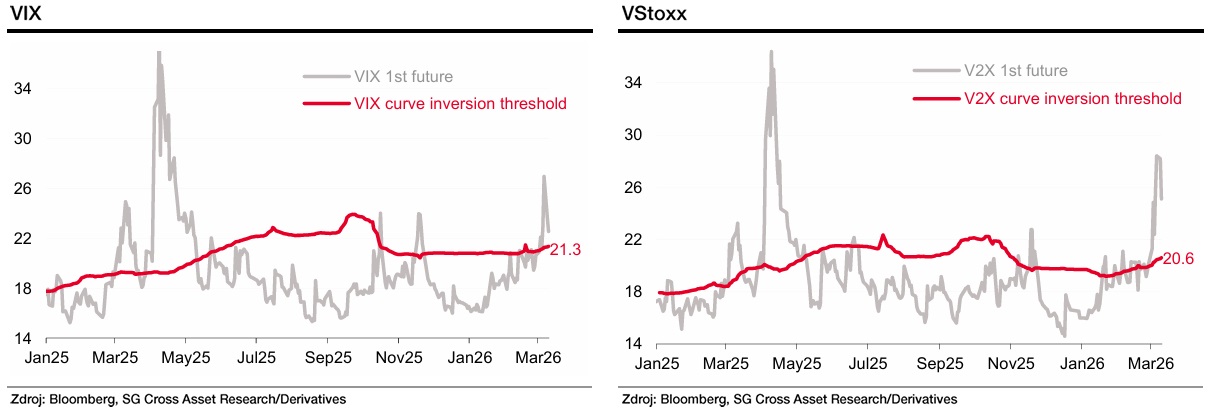Důležitou kontrolkou aktuální nálady zůstává zmíněný VIX pro americké trhy a jeho evropský protějšek VStoxx. Hranice okolo 21 bodů u obou ukazuje, zda se křivka volatility vrací k normálu. USA jsou tomuto návratu blíž, Evropa tak zůstává nervóznější a citlivější na přicházející zprávy.