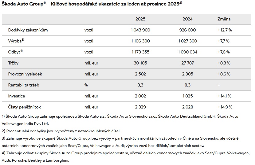 V náročném mezinárodním prostředí česká automobilka prokázala odolnost svého obchodního modelu. V roce 2025 dosáhla rekordních finančních výsledků s historicky nejvyššími tržbami 30,1 miliardy eur i provozním ziskem ve výši 2,5 miliardy eur.