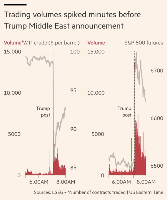 Někdo ideálním načasováním rozsáhlého obchodu, prodejem ropy a nákupem amerických akcií, vydělal balík, když za čtvrt hodiny, po Trumpově oznámení, vskutku cena ropy spadla, zatímco akcie poskočily výše.