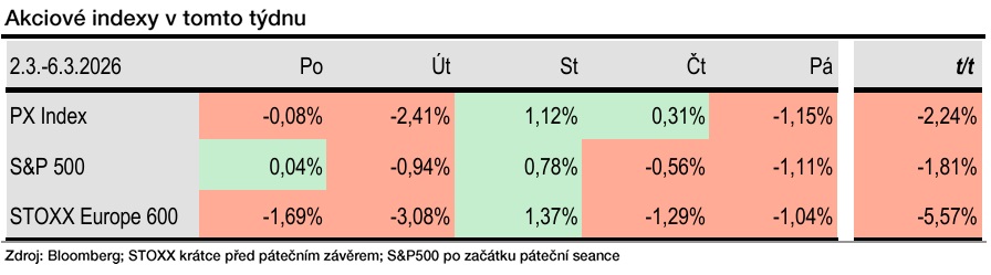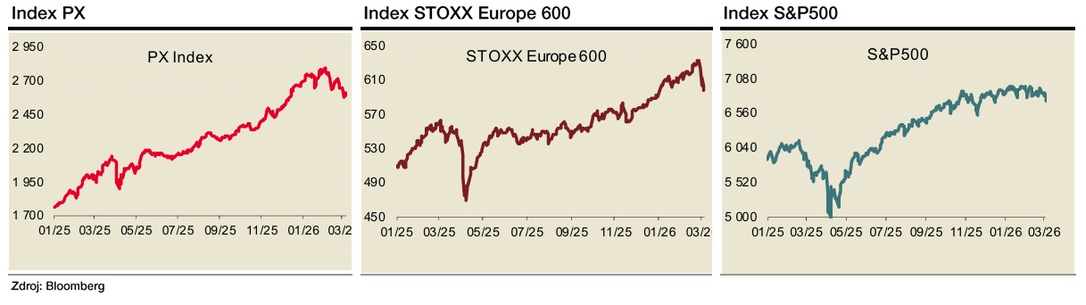 V pátek 27. 2. 2026 dosáhl index STOXX Europe 600 nového historického maxima. Tento týden ale začal poklesem a nesl se v jeho duchu. Evropské akcie (STOXX Europe 600) zahájily týden podstatně slabší ve srovnání se zámořským indexem. Na začátku týdne klesaly daleko rychleji než S&P500.