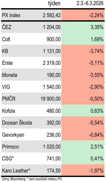 Index PX se v pondělí (-0,08 %) pomalu rozjížděl. Reakce na konflikt na Blízkém východě přišla v úterý, kdy se hodnota PX snížila o 2,41 procenta. Ve středu (+1,12 %) a ve čtvrtek (+0,31 %) index rostl. V závěru týdne pak zaznamenal ztrátu 1,15 procenta. V součtu za celý týden index PX odepsal 2,24 procenta (2 592,42 b.).
