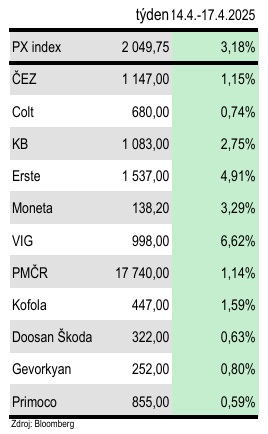 Index pražské burzy PX se tento týden dostal opět nad hranici dvou tisíc bodů. V kratším týdnu (Velký pátek, pozn. aut.) rostl zejména v pondělí a úterý. Ve středu mírně toto zhodnocení korigoval, aby ve čtvrtek opět posílil. Za celý týden si tak připsal 3,18 procenta (2 049,75 b.).