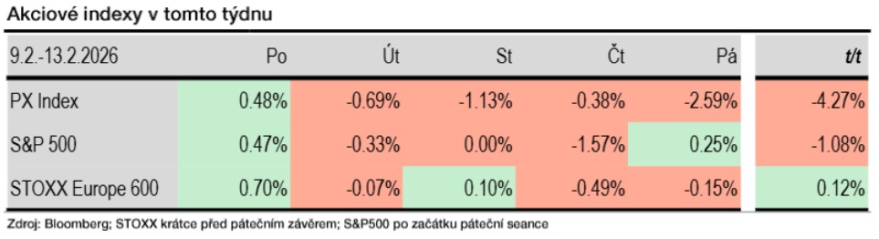Evropský index STOXX Europe 600 měl víceméně stejnou dynamiku jako zámořský kolega. Ve středu pak lehkým růstem stanovil nové historické maximum (621,58 b.). V pátek krátce před koncem obchodování klesal o 0,1 procenta. Za celý týden skončí lehce silnější o asi 0,1 procenta.