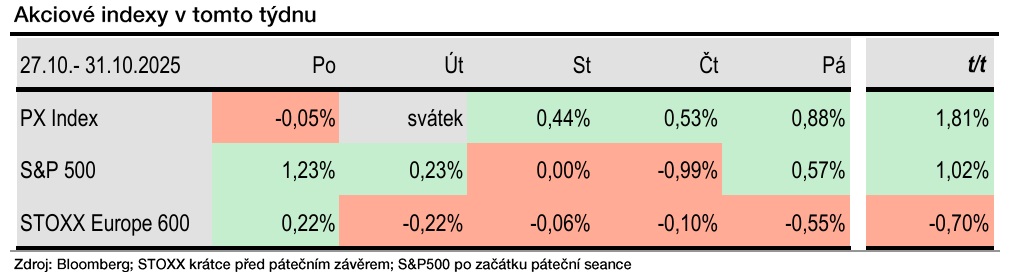 Evropský index STOXX Europe 600 dosáhl nového maxima (577,03 b.) hned v pondělí. Ve zbytku týdne hodnota indexu klesala. V pátek byl index krátce před koncem obchodování slabší o 0,5 procenta. Po dvou růstových týdnech tak tentokrát oslabí o asi 0,7 procenta.